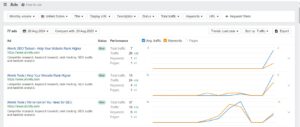See the ad copy your competitors are using, as well as the keywords for each ad, how they affected traffic, and where the ad ranks in paid search results. This tool not only provides content and keyword ideas, but you can also see how your competitors’ top ads influence their paid traffic. A screen showing Ahrefs analysis of paid search advertising.