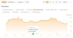 Ahrefs just introduced this tool in August, and it’s a banger! Did a competitor suddenly outrank you on a cherished high-volume keyword? This tool enables you to see exactly what content changes might have affected your – or a competitor’s – changes in traffic. You might also discover that a dip in traffic was caused by a change you inadvertently made to your own website. Either way, it’s a valuable tool to see the influence content has on rankings and traffic. A screen of Ahrefs Content Changes tool showing an orange graph.