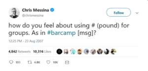 The hashtag, as used in social media, got its start on Twitter, but it wasn’t immediately embraced. In 2007, product designer and social technology expert Chris Messina suggested to his Twitter followers that using the hashtag might be a good way to organize tweets.