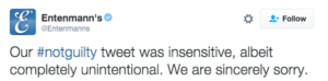 Alternatively, you don’t want to create a campaign that is completely out of context or misinterpreted. In July 2011, sweet bread company Entenmann’s told followers that they should feel #NotGuilty for eating their low-calorie products. At the time, the Casey Anthony trial had just ended, and “not guilty” was trending after the verdict. Twitter users saw this ill-timed tag and assumed Entenmann’s was using the trial (and the tragic death of Anthony’s child) to generate brand visibility. Entenmann’s deleted the tweet and apologized, but by then the damage was done.