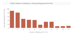 With a 280-character limit, less is best for Twitter. This philosophy carries over to hashtag use on the platform. Tweets with only one hashtag received the most engagement in the TrackMaven study. Note the sharp decline in engagement as hashtags per post increase in the graph below.