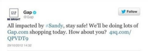 The Gap’s tweet about staying indoors during Hurricane #Sandy fell flat, and for good reason: