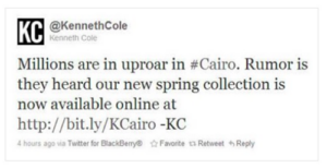 Kenneth Cole’s tone-deaf post that tried to capitalize on the Arab Spring is one of the most-referenced newsjacking fails. As citizens in Egypt were fighting and dying for political freedom, Kenneth Cole posted this (now deleted) tweet:
